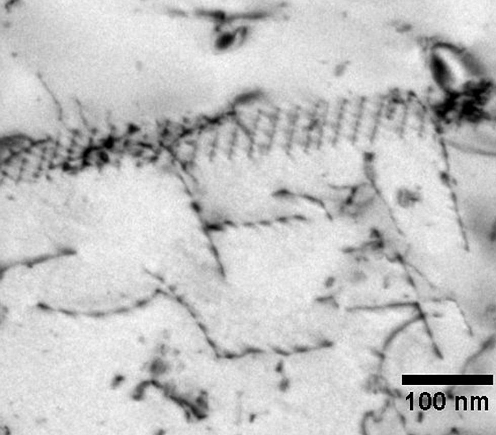 Imagem de campo claro de amostra de aço, onde podem ser observados defeitos na superfície da amostra.