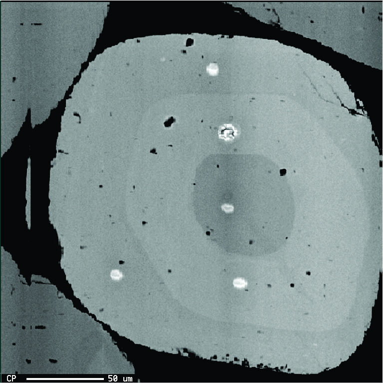Imagem de elétrons retroespalhados de cristal de monazita mostrando diferentes domínios composicionais.