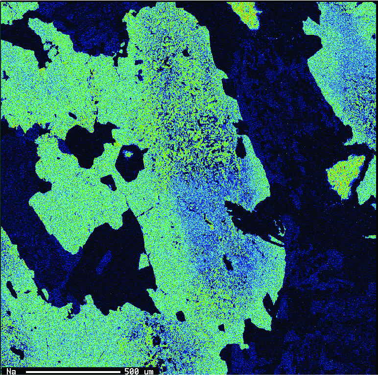 Cristal de plagioclásio Centro de Microscopia2025-11-06T20:43:01-03:00 Mapa de concentração de sódio (Na) em um cristal de plagioclásio. Áreas mais claras indicam maior concentração de sódio. Equipamento: Microssonda Eletrônica Jeol JXA 8900RL WD/ED Combined Microanalyzer Imagem obtida por Ramon de Oliveira Aranda, CM-UFMG