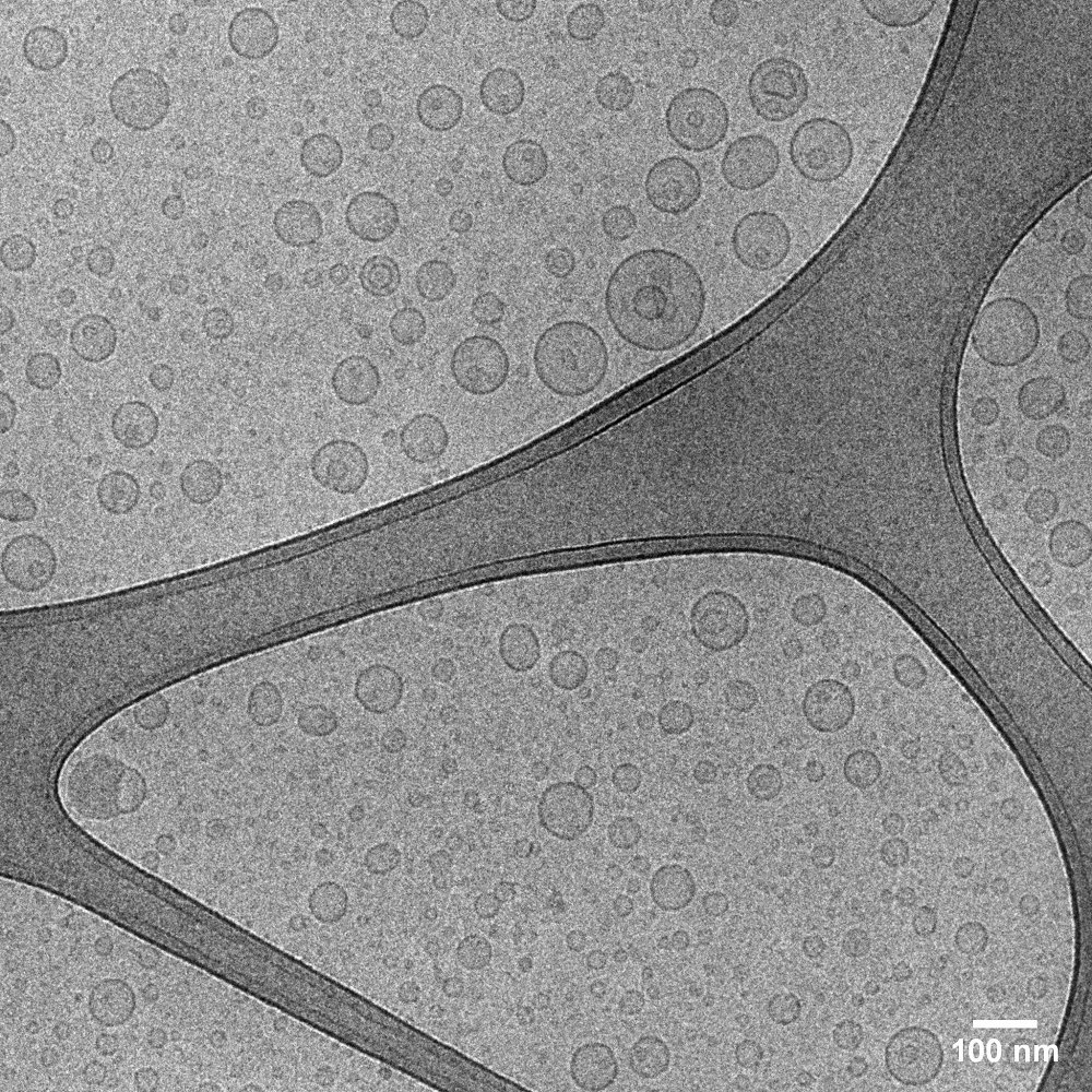Imagem de criomicroscopia de lipossomas pH-sensíveis compostos por succinato de tocoferila e doxorrubicina, desenvolvidos para tratamento de tumor de mama experimental.